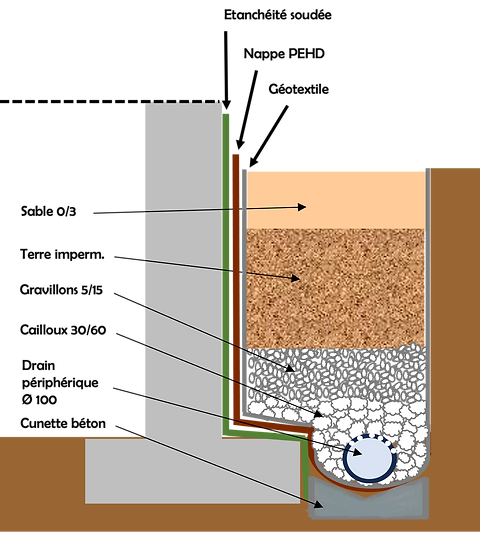 Ce dispositif permet la collecte du surplus d’eau contenu dans le sol pour le diriger vers le réseau d’eaux pluviales.